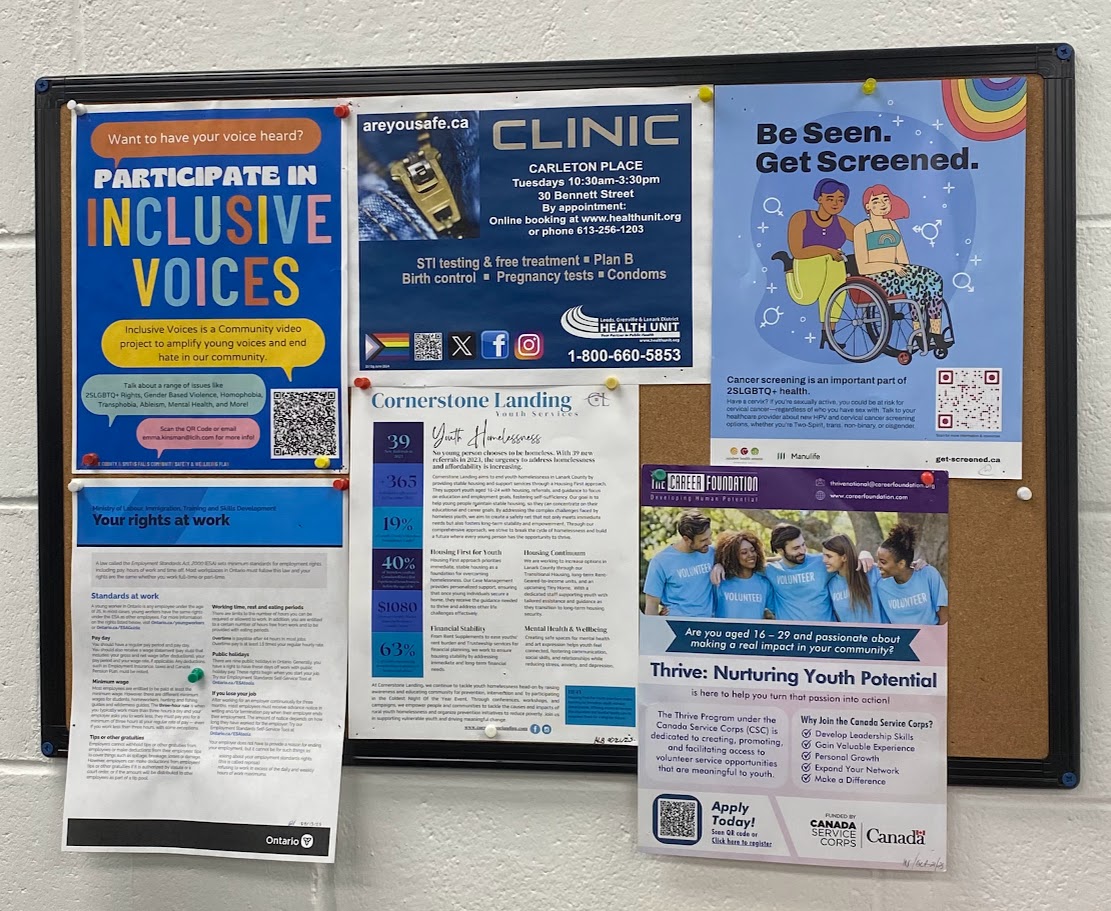The Community Information Board is located in the lobby of the library, and showcases posters and flyers that provide information that may be specifically relevent to young adult readers. Like the community information board, it is managed by library staff, and rotated regularly.