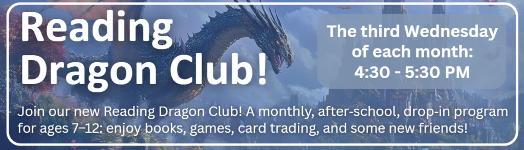 Are you between the ages of 7 and 12, and want to have some fun at the library? Then join us once a month for our new Reading Dragon Club! We’ll be playing some games, chatting about books, and making friends in the Barbra Walsh Room at the library! No registraton required – Click the link below to find out more!