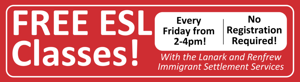 We’re so pleased to partner with Lanark and Renfrew Immigrant Settlement Services to offer Free English as a Second Language sessions every Friday afternoon from 2-4 pm. No registration needed, just drop in for a very relaxed and welcoming group.
