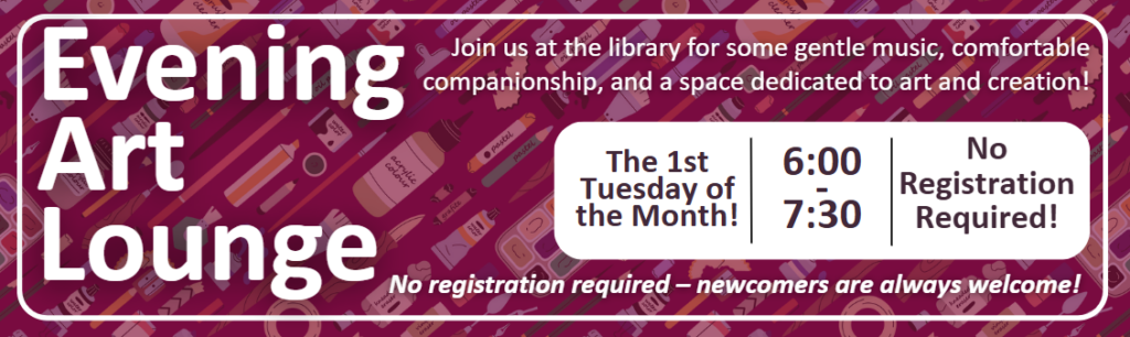 Join us on the first Tuesday of each month for our Evening Art Lounge! Come with your art supplies or use our provided basic drawing materials to create something creative. No registration required – newcomers are always welcome! If you have any questions, please contact Julia at jhawkins@carletonplace.ca
